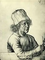 Barbara Holper was the daughter of Hieronymus Holper, under whom Albrecht the Elder served his apprenticeship as a goldsmith.[20] The two men became friends, and when she came of age Holper gave his daughter into marriage when Dürer senior was 40 and she was 15.[18] The couple were compatible, well-matched and fond of each other. Yet their son's writings detail their difficult lives and many setbacks; three of their 18 children survived into adulthood – 17 of whom had been born by the time of this portrait.[21] After her husband died Barbara was destitute and went to live with her son.[22] After she in turn died in 1514, her son wrote "This my pious Mother ... often had the plague and many other severe and strange illnesses, and she suffered great poverty, scorn, contempt, mocking words, terrors, and great adversities. Yet she bore no malice. Also she died hard ... I felt so grieved for her that I cannot express it."[23]