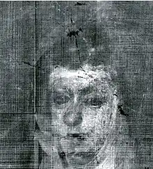 The painting was recorded in a 1700 inventory when it was paired with Philip IV in Armour with a Lion, which is now in El Escorial, Madrid,[3] and attributed to members of his workshop. Velázquez's portrait of Philip is unfinished; some sections, including the lion, are described by art historian Julián Gállego as "hardly more than sketched".[33] According to the art historian Georgia Mancini, sometime before 1700, another hand "added a piece of canvas to the top of the original composition and painted the upper part of the curtain", so as it would match the size of Philip's portrait.[3]
