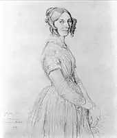 Ingres' early career coincided with the Romantic movement, which reacted against the prevailing neoclassical style. Neoclassicism in French art had developed as artists saw themselves as part of the cultural center of Europe, and France as the successor to Rome.[7] Romantic painting was freer and more expressive, preoccupied more with colour than with line or form, and more focused on style than on subject matter. Paintings based on classical themes fell out of fashion, replaced by contemporary rather than historical subject matter, especially in portraiture. Ingres resisted this trend,[8] and wrote, "The history painter shows the species in general; while the portrait painter represents only the specific individual—a model often ordinary and full of shortcomings."[9] From his early career, Ingres' main source of income was commissioned portraits, a genre he dismissed as lacking in grandeur. The success of his The Vow of Louis XIII at the 1824 Salon marked an abrupt change in his fortunes: he received a series of commissions for large history paintings, and for the next decade he painted few portraits.[10] His financial difficulties behind him, Ingres could afford to concentrate on historical subjects, although he was highly sought-after as a portraitist. He wrote in 1847, "Damned portraits, they are so difficult to do that they prevent me getting on with greater things that I could do more quickly."[11]