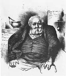 Given the standings of the two men, the painting was received in both social and political terms. A number of writers mentioned Bertin's eventful career, in tones that were, according to art historian Andrew Carrington Shelton, either "bitingly sarcastic [or] fawningly reverential".[38] There were many satirical reproductions and pointed editorials in the following years. Aware of Bertin's support of the July Monarchy, writers at the La Gazette de France viewed the portrait as the epitome of the "opportunism and cynicism" of the new regime. Their anonymous critic excitedly wondered "what bitter irony it expresses, what hardened skepticism, sarcasm and ... pronounced cynicism".[42]
