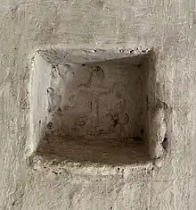 The most prominent internal feature of the chapel is the stone altar. As was the practice until Vatican II, the priest celebrated mass with his back to the congregation, and the altar is placed against a wall. The square central depression in the altar table was probably intended for an Altar stone.[7] This would have been a small, portable, stone slab that incorporated an integral, man-made depression in which the relic of a saint, such as a sliver of bone, had been sealed. It need not have been a permanent fixture in the altar itself, but such a stone, with its relic, was a requisite for the celebration of Mass.[8] Another feature of note is the niche inset on the south wall. This was undoubtedly intended for liturgical use, since it incorporates a simple cross sculpted on its rear wall. A lavabo, a place for the ritual washing of the priest’s hands during mass, was its most likely purpose, although other uses are possible.
