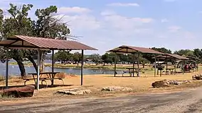 Possum Kingdom State Park is a state park in Palo Pinto County, Texas, USA, that was built in the 1940s by Civilian Conservation Corps Company 2888 and opened to the public in 1950.[2] It covers approximately 1,530 acres (620 ha), and lies in the Palo Pinto Mountains and Brazos River Valley of Texas. The park borders the large Possum Kingdom Lake, a 20,000-acre (8,100 ha) lake known for its clear blue waters. Possum Kingdom winds for 65 miles (105 km) down the Brazos River, and has more than 300 miles (480 km) of shoreline. A privately owned store and marina in the park cater to boaters and campers.