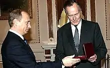 Bush (right) with Russian president Vladimir Putin as he receives the Jubilee Medal "60 Years of Victory in the Great Patriotic War 1941–1945" from Putin in 2005.