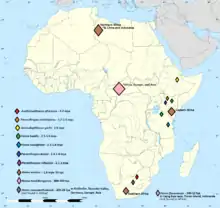 The first specimen of Paranthropus aethiopicus was discovered in Lake Turkana, Kenya and its successor, Paranthropus robustus, was found in the northern parts of South Africa (Swartkrans, Kromdraai and Drimolen).[9] Paranthropus boisei, the last species included in the genus Paranthropus, was first found in Olduvai Gorge, Tanzania and around Ethiopia and Kenya.[10] P. boisei was known for massive facial and dental bones and structure, primarily larger mandibles, molars, and premolars, which was an adaptation allowing them to consume hard plant foods with the ability of high force chewing.[10]