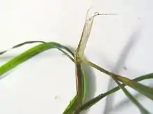 Potamogeton compressus produces a strongly flattened, robust, branching stem up to 90 cm in maximum length.[4] It grows annually from turions and seed, producing bushy plants branching near the surface with long, rather grass-like leaves that are 85–240 mm long and 3–6 mm wide and olive-green or dark green, sometimes with a reddish tinge near the surface.[4] Each leaf has two veins either side of the midrib and is bluntly pointed. The leaves have a rather opaque appearance compared to the transparent leaves of most pondweeds due to the presence of fibres called sclerenchymatous strands. There are no rhizomes or floating leaves.