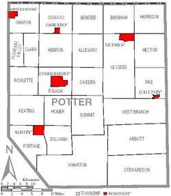 Under Pennsylvania law, the four types of incorporated municipalities are cities, boroughs, townships, and in at most two cases, towns. These boroughs and townships are located in Potter County: