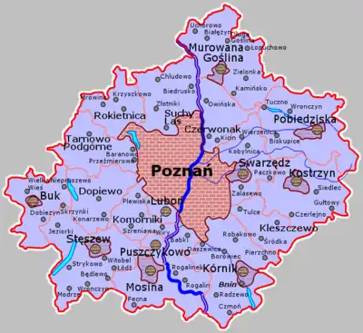 Poznań County (Polish: powiat poznański) is a unit of territorial administration and local government (powiat) in Greater Poland Voivodeship, west-central Poland. It came into being on January 1, 1999, as a result of the Polish local government reforms passed in 1998. Its administrative seat is the city of Poznań, although the city is not part of the county (it constitutes a separate city county). The county's administrative offices (starostwo powiatowe) are in the Jeżyce neighbourhood of Poznań.