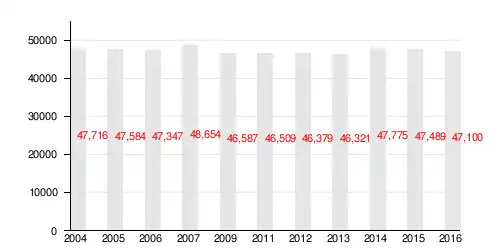 According to the Central Statistical Office data, the district's area is 6.44 square kilometres (2.49 square miles) and 47 775 people inhabit Prądnik Czerwony.[2]