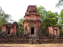 Prasat Bei (Khmer: ប្រាសាទបី, "three temples") is a temple with three brick towers in a north-south row, facing to the east, and standing on a laterite platform. The central tower contained a linga; the flanking towers reach no higher than the doorways. Only the lintels of the central and south towers were carved, both showing Indra on the elephant Airavata.[1]