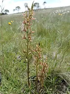 This leek orchid grows in grassland on heavy, black basaltic soil on the New England Tableland.[2]
