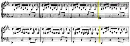 The composition is written on the next two pages, on systems of two staffs, with a soprano clef for the upper staff, and a bass clef for the lower staff. Although, in the first half of the 18th century, a tablature notation was common for lute compositions, Kellner thus wrote the Prelude down in a notation which at the time was customary for keyboard compositions.[10] The Prelude can be performed as well on a keyboard instrument as on a lute.[11][12][13] Kellner is known as organist and keyboard performer: his copy of BWV 999 is the only extant instance of him taking an interest in a composition for lute.[11]