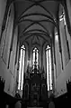 The interior of the church is preserved in former early Gothic style with small Baroque complements in the eastern part. The three-nave basilica church with the embedded transept and the southern entrance is connected by two portals to the cloister. Low aisles are divided from the nave by six pairs of columns. There is a cross vault with profiled ribs in seven bays. On the side which is opened to the nave the profile of ribs continues to the ground while on other sides ribs are ended by simple supports. On the southern wall former consoles with vegetable motives can be seen. The vault of the nave is also cross, and it is divided into ten bays and there is one with five bays above the chancel. Keystones in naves are decorated. On brackets of ribs different human heads are represented instead of vegetable motives in the nave.