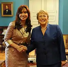In September 2010, it was announced that Argentina was elected president of the Group of 77+China and prepared to act as a ‘bridge" with G-20 major economies to which it also belongs.[82] She visited Chile during their Bicentenary celebrations where she also assisted at the baptism of a Chilean baby, Anaís Escobar Maldonado, born in the Argentine Hospital deployed at Curico after the earthquake. The visit had a high profile in the media mainly because of the possible extradition to Chile of Sergio Apablaza. She met with president Sebastián Piñera and participated in the festivities at the national stadium.[83] She also confirmed the celebration of the III bi-national cabinet meeting for next October.[84][85] Fernández de Kirchner then departed for New York to give her United Nations General Assembly speech where she once again criticized Britain over the Falklands (Malvinas) issue, and Iran for the 1994 AMIA bombing whilst giving her support for an Israeli-Palestinian dialogue and an eventual Palestinian state.[86] On 30 September she hosted the UNASUR presidents' emergency summit at Buenos Aires due to the Ecuador crisis and started an official visit to Germany the following day in order to participate as a Guest of Honour at the Frankfurt Book Fair[87] and meet with Chancellor Angela Merkel. In October she inaugurates the III News Agencies World Congress to be held in Bariloche.[88] This same month, and as part of the 2006 civilian nuclear-power reactivation program, Fernández reopened the Pilcaniyeu uranium enrichment plant, put on ice in the 1990s, amid worsening shortages of natural gas.[89] Following the death of her spouse (see below), she also resumed activities and flew to South Korea for the G20 Seoul summit. After her return she announces that the Paris Club agrees to debt talks without the International Monetary Fund intervention as proposed by Argentina since 2008. These negotiations will result in the settlement of the last portion of the sovereign debt defaulted in the 2001 crisis after the successful restructuring debts of 2005 and 2009.[90] In November she also participated in the UNASUR Summit at Guyana after which will host the XX Ibero-American Summit at Mar del Plata.