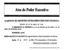 - ↑ "Pelé deixa governo e ministério é extinto". Folha de S. Paulo. 1998-05-01. Retrieved 2024-01-11.