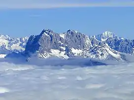 Presolana in winter as seen from Mount Alben, emerging above low-lying stratus clouds.