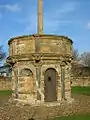 Two of Preston's most important structures were Preston Tower and Preston mercat cross. The mercat cross which dates from 1617, is unique both in its integrity and in that it is the only such structure in Scotland still in its original location and form. It has eight compartments, two doorways, six alcoves with semi-circular mouldings of scallop shells. The latter are said to be an allusion to the pilgrim traffic between North Berwick and St Andrews.