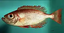The Atlantic bigeye is a small to medium sized perciform fish. Almost all parts of the fish are entirely reddish-orange, including the eyes. The dorsal fin has 10 spines, and 14 rays. The anal fin has 3 spines and 15 rays. Atlantic bigeye are commonly found at around 14 in. The IGFA world record is 50 cm, or about 20", caught in 2001.[1] The eyes of the Atlantic bigeye are large, due to being primarily nocturnal feeders. Atlantic bigeye form small aggregations near the bottom of the ocean at night.[2]