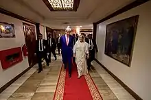 U.S. Secretary of State John Kerry walks through the Cross Hall with Bangladeshi Prime Minister Sheikh Hasina Wazed at the Prime Minister's Office in Dhaka.
