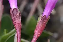 Primula wulfeniana is a herbaceous perennial plant.[1] The species is diploid, possessing a chromosome count of (2n = 66).[2] The leaves of Primula wulfeniana are obovate to elliptic in shape, sharply acute at the tips, and possess a leathery texture with cartilaginous characteristics.[3] They exhibit entire margins and have a dark green coloration on the upper surface, while appearing paler underneath.[3] The average leaf size ranges from 1 to 4 cm in length and 5 to 12 mm in width.[2] Apart from marginal glands, the leaves are devoid of hairs.[2] The flowers of this plant display a reddish-lilac hue and feature a distinct white eye.[3] They are funnel-shaped to flat and have a diameter of approximately 2 to 3 cm.[3] Often, these flowers are nearly stemless.[3] The calyx of the flower is egg-shaped and possesses blunt sepal-lobes. The petal lobes are strap-shaped and narrowly notched.[2]