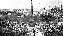 An inscription on the south face records that its foundation stone was laid by Lady Butler on 4 August 1902, and (now almost illegible) that the completed memorial was unveiled on 8 August 1903 by Lady Audrey Buller, wife of General Redvers Buller.