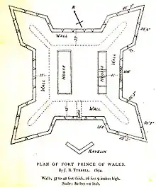 Construction of this fort was started in 1731 near what was then called Eskimo Point. It was in the form of a square, with sides 90 m (300 ft) long and walls 6 m (20 ft) tall and 9 m (30 ft) thick at the base.[3]