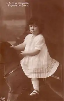 Princess Eugénie of Greece and Denmark (Greek: Ευγενία, romanized: Evyenía; 10 February 1910 – 13 February 1989) was the youngest child and only daughter of Prince George of Greece and Denmark and his wife, Princess Marie Bonaparte, daughter of Marie-Félix Blanc and Prince Roland Bonaparte, a great-nephew of Napoleon I. Her father was the second son of George I of Greece and Olga Constantinovna of Russia.