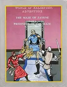 Prisoners of the Maze is a scenario for character levels 8-12, set in the World of Kalibruhn. The heroes must assassinate a mad tyrannical king. This it the first in the four-part "Maze of Zayene" series; Dimensions of Flight is the sequel.[1]