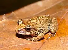 The characteristics of this species are: a dark reticulation enclosing pale spots in the groin and the concealed surfaces of the thighs; distinct labial stripes and a distinct, superficial Tympanum; the eyelid and the heel either having nonconical or subconical tubercles; the absence of vocal slits in males and a polymorphic dorsal pattern.[2][5]