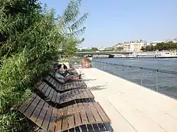 The Promenade des Berges de la Seine is a public park and promenade located along the left bank of the Seine river in the 7th arrondissement of Paris, between the Pont de l'Alma and the Musée d'Orsay. The promenade, created on the former highway that ran along the left bank, includes five floating gardens, planted atop barges, plus exhibition areas, performance and classroom spaces, playgrounds, sports facilities and cafes. Begun in 2008, it was opened by Mayor Bertrand Delanoë on June 19, 2013. Everything in the park can be dismantled and moved within 24 hours if the water of the river rises too high.[1]