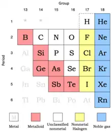 - ↑ An ionisation energy of less than 750 kJ/mol is taken to be low, 750–1000 is moderate, and > 1000 is high (> 2000 is very high); an electron affinity of less than 70 kJ/mol is taken to be low, 70–140 is moderate, and > 140 is high; an electronegativity of less than 1.8 is taken to be low; 1.8–2.2 is moderate; and > than 2.2 is high (> 4.0 is very high).