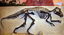 The second species, P. blackfeetensis, is based on a specimen in the Museum of the Rockies (MOR 454), which was described by another notable paleontologist, Jack Horner. This specimen, and the remains of three or four other individuals, were found in Glacier County, Montana.[8] In this case, the fossils were found in a bonebed of Prosaurolophus remains, which indicates that the animals lived together for at least some time. The bonebed is interpreted as reflecting a group of animals that congregated near a water source during a drought.[9]
