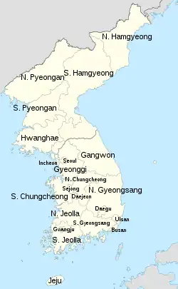 | Name | Official English name[1] | Hangul | Hanja | ISO | Pop. (2020)[2] | Area (km2) | Density 2020 (/km2) | Capital | Historical province | Cultural region | Abbreviation | ||