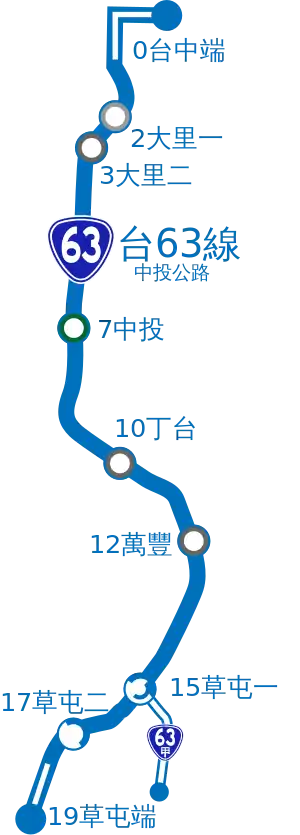 Provincial Highway 63 (Chinese: 台63線) is a limited-access highway, which begins in Taichung at the intersection of Guoguang Road (Provincial Highway No. 3) and Zhongming South Road and ends in Caotun, Nantou on Bixing Road (Provincial Road 14B). It is commonly known as Zhongtou (Taichung-Nantou) Highway.