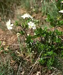 The bark is dark brown with yellow lenticels. The leaves are oblanceolate to obovate, about 12 mm by 6 mm, with acuminate apex, glabrous above, thick, serrated with crenate margin, dark green, yellow in autumn, with a short petiole.