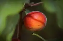 The fruits, maturing in early- to mid-summer,[4][7][8] are yellow to orange-red, but on the side facing the sun they are reddish. The dry and densely textured flesh (mesocarp) easily separates from the stone (endocarp) and opens along the ventral suture at full maturity. It may be only 2.5 to 3 mm thick. The compressed spherical stone inside the fruit has a smooth surface, and a diameter of 1.2 to 2.5 centimeters. The seed inside is hardly edible and somewhat bitter.