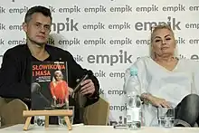 ![]() Artur Górski, a crime journalist, and Monika Banasiak, the wife of one of the leaders of the mafia, presenting Górski's book on the organization, 2017 | |