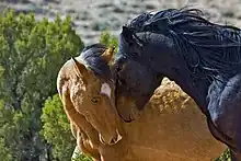 The Pryor Mountains Wild Horse Range is a refuge for a historically significant herd of free-roaming mustangs, the Pryor Mountain mustang, feral horses colloquially called "wild horses",[1] located in the Pryor Mountains of Montana and Wyoming in the United States. The range has an area of 39,650 acres (160.5 km2)[2] and was established in 1968 along the Montana–Wyoming border as the first protected refuge dedicated exclusively for mustangs.[3] It was the second feral horse refuge in the United States.[4] About a quarter of the refuge lies within the Bighorn Canyon National Recreation Area.[5] A group of federal agencies, led by the Bureau of Land Management, administers the range.[6]