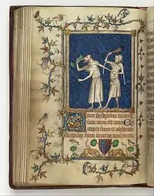 The page illustrating Psalm 53, The Fool Hath said in his heart, There is no God, shows a man drinking from a chalice, a typical attribute of the fool, signifying drunkenness. He is held back by another man who holds his long hood and beats him. This second character probably comes from the tradition of depicting the fool as a yokel or madman clutching a cudgel.[8] The first fool has variously been identified as a drunkard, a monk, and Archbishop Baldwin of Luxembourg. A contemporary viewer would have likely recognised him as a Jew.[9][10] Both men contain elements of the grotesque, and are executed in grisaille against a deep blue background. The bas-de-page contains two lions gnawing at the Bonne of Luxembourg coat-of-arms.[5]