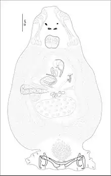 The sclerotized male copulatory organ, or "quadriloculate organ", has the shape of a bean with four internal chambers, as in other species of Pseudorhabdosynochus.[2]