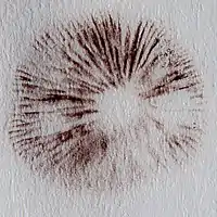 • Pileus: The cap of P. semilanceata is 5–30 mm (0.2–1.2 in) in diameter[22] and 6–22 mm (0.24–0.87 in) tall. It varies in shape from sharply conical to bell-shaped, often with a prominent papilla (a nipple-shaped structure), and does not change shape considerably as it ages. The cap margin is initially rolled inward but unrolls to become straight or even curled upwards in maturity. The cap is hygrophanous, meaning it assumes different colors depending on its state of hydration. When it is moist, the cap is ochraceous to pale brown to dark chestnut brown, but darker in the center, often with a greenish-blue tinge. When moist, radial lines can be seen through the cap that correspond to the positions of the gills underneath. When the cap is dry, it becomes much paler, a light yellow-brown color.[2] Moist mushrooms have sticky surfaces that result from a thin gelatinous film called a pellicle.[23] This film becomes apparent if a piece of the cap is broken by bending it back and peeling away the piece. When the cap dries from exposure to the sun, the film turns whitish and is no longer peelable.[24]