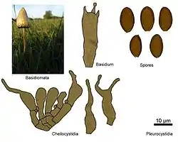In deposit, the spores are a deep reddish purple-brown color. The use of an optical microscope can reveal further details: the spores are oblong when seen in side view, and oblong to oval in frontal view, with dimensions of 10.5–15 by 6.5–8.5 μm. The basidia (spore bearing cells of the hymenium), are 20–31 by 5–9 μm, four-spored, and have clamps at their bases; there are no basidia found on the sterile gill edge. The cheilocystidia (cystidia on the gill edge) measure 15–30 by 4–7 μm, and are flask-shaped with long thin necks that are 1–3.5 μm wide. P. semilanceata does not have pleurocystidia (cystidia on the gill face). The cap cuticle is up to 90 μm thick, and is made of a tissue layer called an ixocutis—a gelatinized layer of hyphae lying parallel to the cap surface. The hyphae comprising the ixocutis are cylindrical, hyaline, and 1–3.5 μm wide. Immediately under the cap cuticle is the subpellis, made of hyphae that are 4–12 μm wide with yellowish-brown encrusted walls. There are clamp connections present in the hyphae of all tissues.[2]