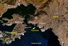 Psyttaleia (Greek: Ψυττάλεια) is an uninhabited island in the Saronic Gulf between the harbor of Piraeus and the Kynosoura peninsula on Salamis Island, Greece. It covers an area of 0.375 square kilometers. The island houses Athens' largest sewage treatment plant[1][2] which also the largest in Europe,[3][4] with a projected daily maximum drying capacity of 750 tons of sewage.[5] Administratively it is part of the Municipality of Piraeus.