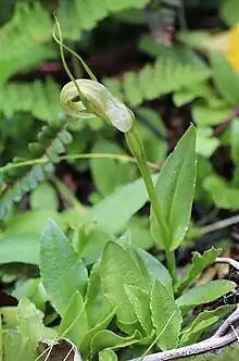 Pterostylis oliveri is a species of greenhood orchid endemic to New Zealand. Flowering have plants spreading leaves on the flowering stem and a single green and white flower with a strongly down-curved dorsal sepal and long, tapering lateral sepals.
