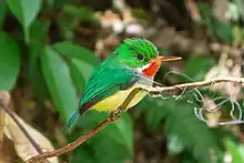 The Puerto Rican tody is a small, brightly colored, non-passerine forest bird.[5][6] It is one of the smallest representative of the order Coraciiformes, with an average body length of 11 cm and weight of 5 to 6 g.[5][6] The upperparts of the Puerto Rican tody are an emerald green color, and it has light-yellow flanks and underside tail coverts, and a white belly and chest.[6] The "San Pedrito", also known as "Medio Peso" by the local people, has a red throat and lower bill, which in itself is long and broad. It can be as long or longer than the head, and as half as long as the wing. Their legs and feet are a brownish color and the tarsus is similar in length to the bill. Both males and females have a short tail, ranging from two-thirds to three-fourths as long as the wings.[4] Males and females are not sexually dichromatic, and their only difference is their eye color; males have gray eyes whereas females' eyes are white.[6] The young have similar colored feathers as the adults, but lack the red markings, have a grayish colored belly and have shorter bills.[4][7] The Puerto Rican tody differs from the other todies in that it is the only species without pink or yellow-green colored feathers on its flanks.[7]