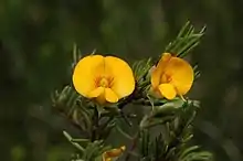 Pultenaea fasciculata, commonly known as alpine bush-pea[2] or bundled bush-pea[3] is a species of flowering plant in the family Fabaceae and is endemic to south-eastern Australia. It is a small prostrate or low-lying shrub with cylindrical leaves and yellow to orange-coloured flowers arranged singly or in small groups near the ends of branchlets.