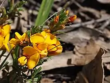 Pultenaea microphylla is an erect to prostrate shrub that typically grows to a height of up to 2 m (6 ft 7 in) and has softly-hairy stems. The leaves are arranged alternately, linear to narrow egg-shaped leaves with the narrower end towards the base, 2–15 mm (0.079–0.591 in) long and 1–2 mm (0.039–0.079 in) wide with a small point on the end. The flowers are arranged singly or in clusters of up to ten near the ends of branchlets, each flower about 5–10 mm (0.20–0.39 in) long on pedicels 1.0–1.5 mm (0.039–0.059 in) long with hairy, narrow triangular bracteoles 1–3 mm (0.039–0.118 in) long attached to the base of the sepal tube. The sepals are 2.5–6 mm (0.098–0.236 in) long and hairy. The standard petal is yellow with red markings and 7–12 mm (0.28–0.47 in) long, the wings yellow and the keel dark red. Flowering occurs from September to December and the fruit is a flat pod 3–5 mm (0.12–0.20 in) long.[2][3][4]