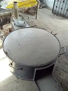 The other type of bhathi is the open top structure where griddles or large utensils are placed on the top of the structure to cook in bulk.[6]