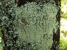 The thallus of Pyxine subcinerea is 3–8 cm (1.2–3.1 in) wide, with an upper surface ranging in colour from yellowish grey to grey to brownish grey or olive-grey. The lobes that comprise the thallus are 0.3–1.5 mm (0.01–0.06 in) wide, somewhat tightly apressed to the substrate and are more or less flat but often somewhat concave near the tips. The lobe surface are pruinose, with the pruina resembling dense points near the lobe tips.[8] These pruina contain weddellite, a mineral form of calcium oxalate.[9] There are distinct pseudocyphellae at the margins of the lobes. The soralia are near the lobe margins. The medulla is quite thin and yellow above. The lower surface is black in the centre, but becomes paler towards the margin. Rhizines are more or less dense, and divided into branches.[8] The upper cortex is paraplectenchymatous (a cell arrangement where the hyphae are oriented in all directions), while the lower cortex is prosoplectenchymatous (a cell arrangement where the hyphae are all oriented in one direction).[10] Apothecia (reproductive structures) are common in tropical and subtropical specimens; they measure 0.3–1.5 mm (0.01–0.06 in) wide and have an indistinct internal stipe.[8] In contrast, apothecia are not typically associated with European material.[10] Ascospores measure 13–22 by 6–9 μm. The conidia are bacilliform, and measure 3–4 μm by about 1 μm.[8]