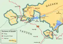 It has two exclaves inside Armenia, which include the villages of Yukhari Askipara, Barkhudarly, Sofulu. Both of the exclaves and parts of mainland Qazax District (the villages of Baghanis Ayrum, Ashaghi Eskipara, Gyzylhajily, and Kheyrimli) were captured by Armenian forces during the First Nagorno-Karabakh war.