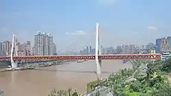 The Qiansimen Bridge (sometimes Qianximen Bridge) crosses the Jialing River with a cable-stayed main span that is 312 metres (1,024 feet), connecting the Jiangbei and the Yuzhong Districts. The placement of the single tower means that the cable-stayed back span of 240 metres (787 feet) provides a secondary channel for shipping. The bridge has a total length of 720 metres (2,362 feet) as it includes girder spans of 88 metres (289 feet) and 80 metres (262 feet). The bridge has nine pairs of cables. The Qiansimen Bridge has the longest stay cable of both bridges, measuring 256.85 metres (843 feet) long.[1] The bridge was shortlisted for an award by the Institution of Structural Engineers.[4]